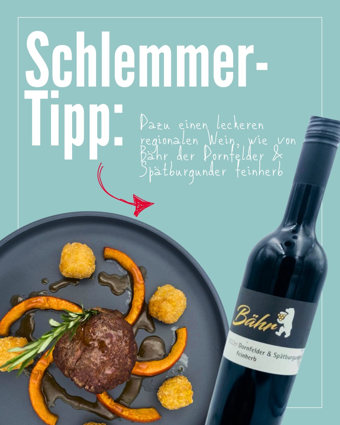 Heute kommt daher ein Schlemmer-Tipp aus unserem Koch-Team. Genau das richtige für die beginnende Vorweihnachtszeit: Rinderfilet mit Kürbisschnitzer und MacnCheese-Balls, getoppt mit einem leckeren Wein des Weinguts Bähr.