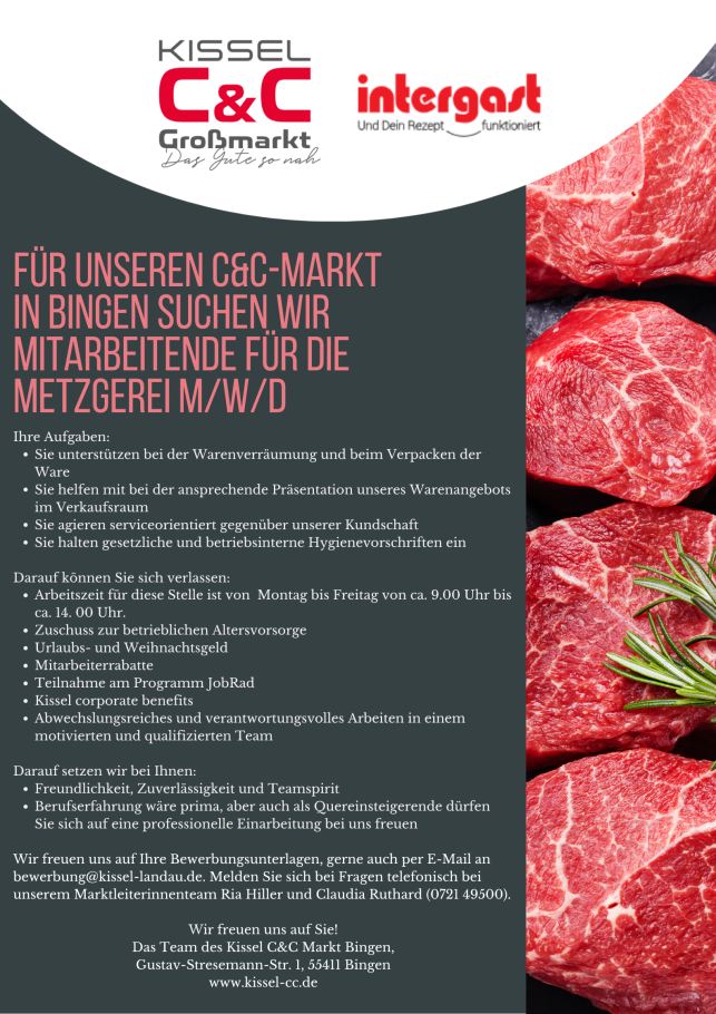 Für unseren C&C-Markt in Bingen suchen wir Mitarbeitende für die Metzgerei m/w/d